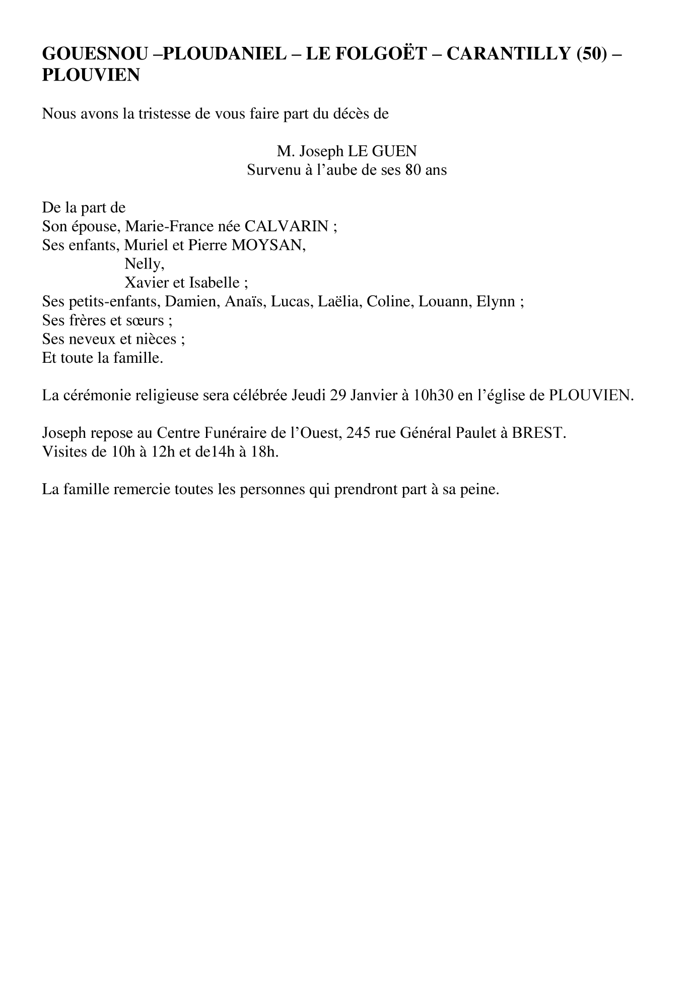 Cet espace « condoléances » est dédié à la mémoire de Monsieur Joseph LE GUEN.